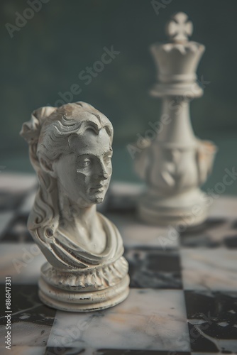 Two white marble classical female figures, one as a chess piece on the left side of the picture and another in the front right hand corner on a checkered table board. Grey background. Soft light. Shal