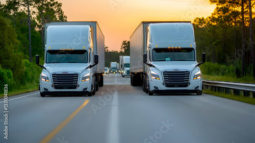Two white semi trucks drive on the road at dusk