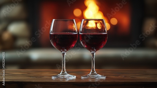 Two Wine Glasses Against a Warm Fireplace Background on Wooden Table Surface in Cozy Interior