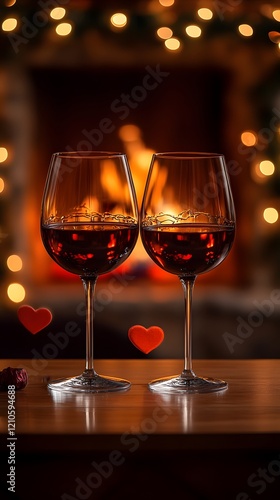Two wine glasses clink before a fireplace, with a blurry heart garland in warm golden tones. The cozy atmosphere evokes romance, perfect for Valentine's Day ads, love celebrations, or promotions.