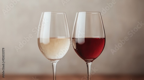 Two wine glasses filled with white and red wine are placed on a wooden table, symbolizing a contrast of flavors and the elegance associated with enjoying fine wine.
