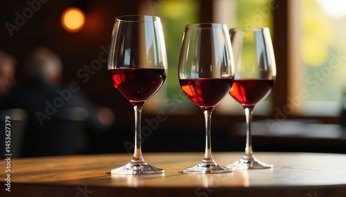 Two wine glasses, one full, one empty, on a wooden table , dark, chianti
