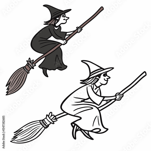 Two witches flying on broomsticks halloween illustration
