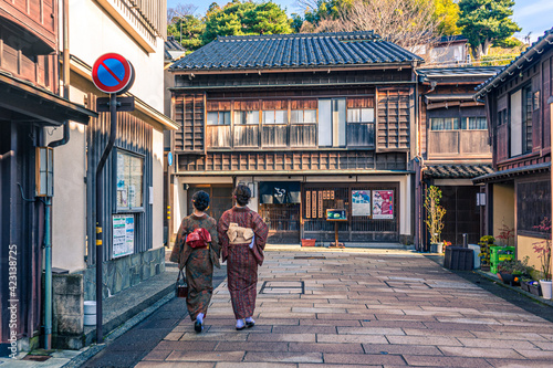 Two woman walk through an old town in Japan
