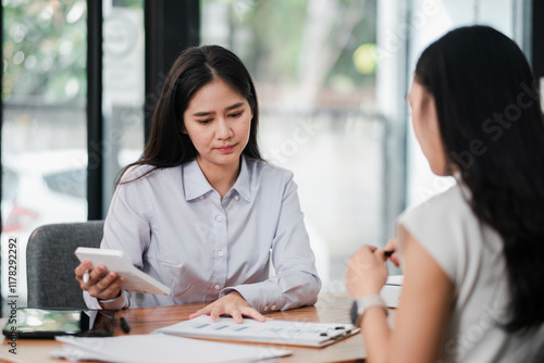 Two women engaged in a business meeting, reviewing documents and using a tablet in a contemporary office environment.