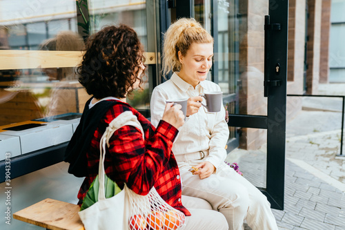 Two women sisters having break during shopping food sitting outdoor over zero waste grocery store glass window background.
