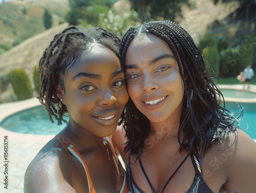 Two women sit together by a pool smiling warmly at the camera. The setting is sunny, with lush greenery in the background, suggesting a relaxing outdoor environment.