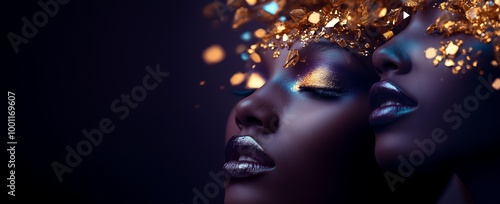 Two women with dark skin and shimmering gold makeup pose with their eyes closed.