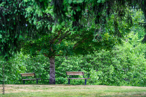 Two wooden bench seats under a deciduous tree in a peaceful green landscape, as a nature background