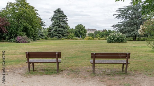 Two wooden benches facing each other in a lush green park with trees and flowers in the background