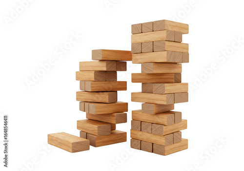 Two wooden block towers, one tall and one shorter, isolated on transparent background