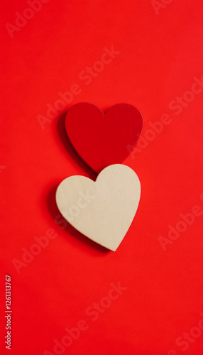 Two wooden hearts, one red and one natural, placed on a red background, symbolizing love and unity for Valentine's Day