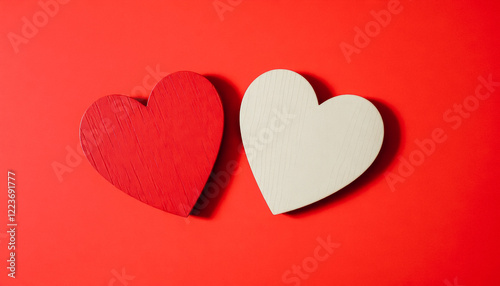 Two wooden hearts, one red and one natural, vertically aligned on a deep red background with dramatic shadows.