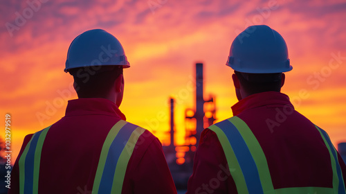 Two workers in hard hats observe a vibrant sunset over an industrial landscape, highlighting teamwork and dedication in a working environment.
