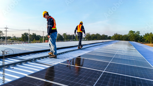 Two workers in safety gear installing solar panels on a rooftop, highlighting renewable energy, sustainability, and the integration of skilled labor in setting up efficient solar power systems.