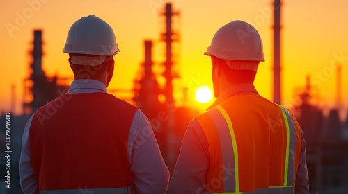 Two workers in safety gear observe a stunning sunset over an industrial landscape, symbolizing hard work and perseverance.