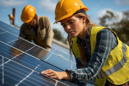 Two workers wearing safety helmets and vests installing solar panels under a bright blue sky, focused on sustainable energy with a calm and diligent atmosphere