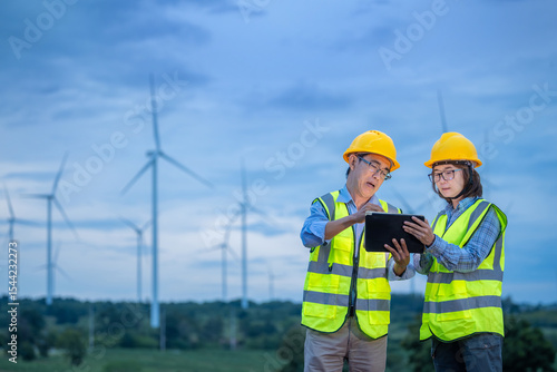 Two workers wearing safety vests and hard hats are looking at a tablet