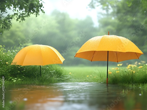 Two Yellow Umbrellas In Rain Beside A Puddle