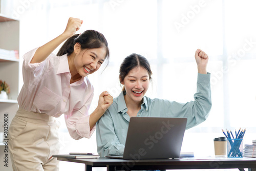 Two young Asian businesswomen show joyful expression of success at work smiling happily with a laptop computer in a modern office.