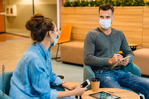 Two young colleagues wearing medical masks against Covid19 talking during coffee break in office