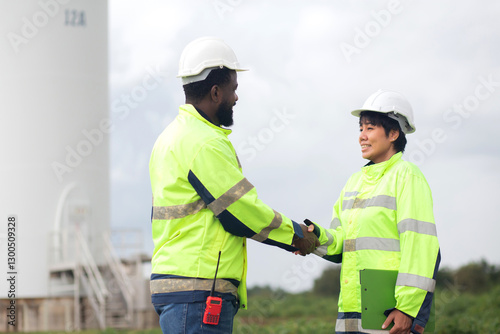 Two young engineer handshake about agreement of success renewable in wind turbines farm, renewable energy and sustainable collaboration for success and innovation, engineer shaking hands.