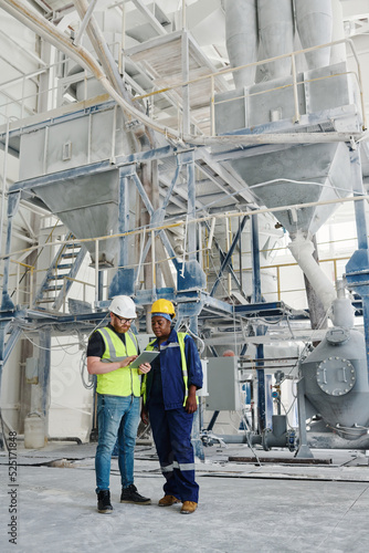 Two young intercultural engineers consulting manual guide in digital tablet while standing in the middle of spacious industrial plant