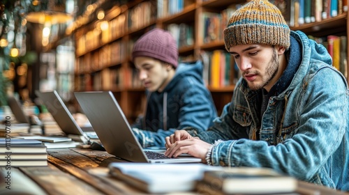 Two young men wearing casual winter outfits work on laptops in a warm library setting, surrounded by books and soft ambient lighting.