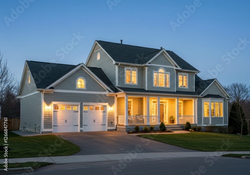 Two-story house at dusk, gray exterior, white trim, porch with columns