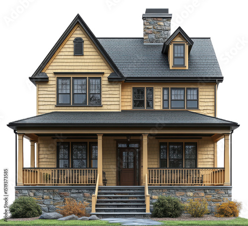 Two-Story House Facade with Porch, Shingle Siding and Stone Base on Transparent PNG Image