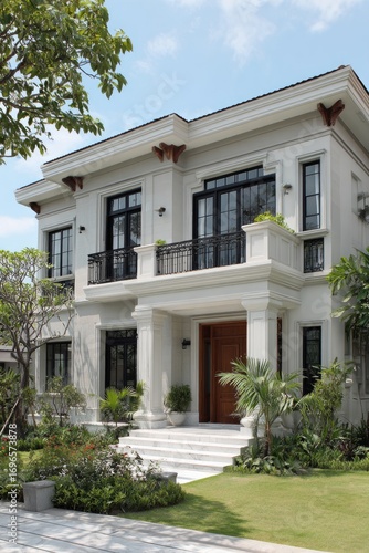 Two-story white house with black windows, columns, and balcony. Lush landscaping