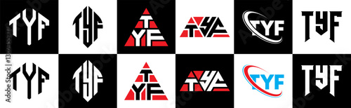 TYF letter logo design in six style. TYF polygon, circle, triangle, hexagon, flat and simple style with black and white color variation letter logo set in one artboard. TYF minimalist and classic logo