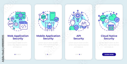 Types of application security onboarding mobile app screen. Walkthrough 4 steps editable graphic instructions with linear concepts. UI, UX, GUI template. Montserrat SemiBold, Regular fonts used