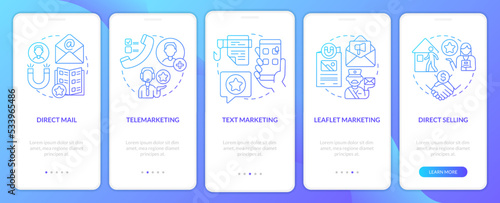 Types of direct marketing blue gradient onboarding mobile app screen. Walkthrough 5 steps graphic instructions with linear concepts. UI, UX, GUI template. Myriad Pro-Bold, Regular fonts used