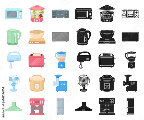 Types of household appliances cartoon,black icons in set collection for design.Kitchen equipment vector symbol stock web illustration.