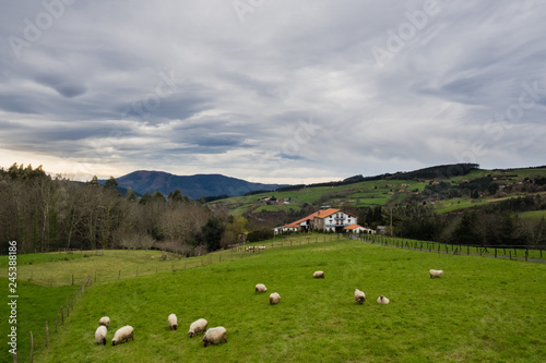 Typical Basque farmhouse with sheep grazing on a cloudy day