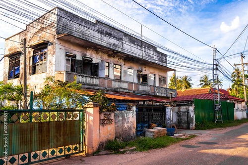 Typical colorful street with buildings trees bumpy road Vientiane Laos.