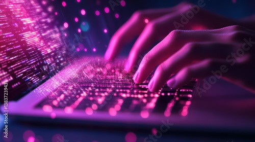 Typing on Illuminated Laptop Keyboard Displaying Complex Digital Information