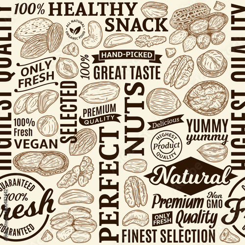 Typographic vector mixed nuts seamless pattern or background. Nut kernels and nutshells illustrations, vector food icons