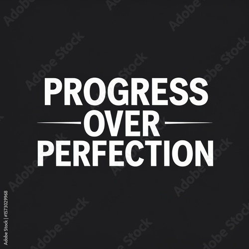 Typography t-shirt design with bold, modern sans-serif text: 'PROGRESS OVER PERFECTION', stacked layout, all caps, white text on black background, clean and minimalist design, no graphics