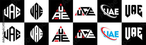 UAE letter logo design in six style. UAE polygon, circle, triangle, hexagon, flat and simple style with black and white color variation letter logo set in one artboard. UAE minimalist and classic logo