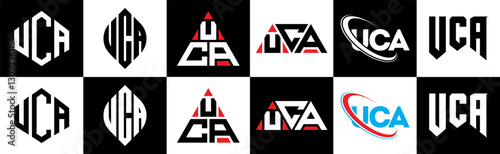 UCA letter logo design in six style. UCA polygon, circle, triangle, hexagon, flat and simple style with black and white color variation letter logo set in one artboard. UCA minimalist and classic logo