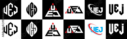 UEJ letter logo design in six style. UEJ polygon, circle, triangle, hexagon, flat and simple style with black and white color variation letter logo set in one artboard. UEJ minimalist and classic logo