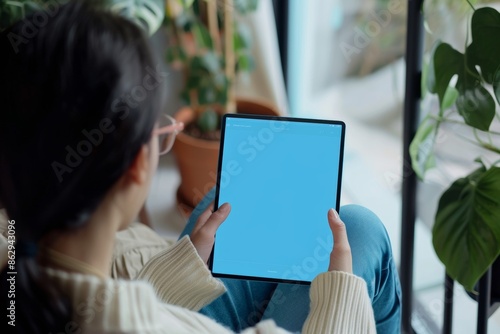 Ui mockup through a shoulder view of a girl holding an ebook with a fully blue screen