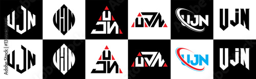 UJN letter logo design in six style. UJN polygon, circle, triangle, hexagon, flat and simple style with black and white color variation letter logo set in one artboard. UJN minimalist and classic logo