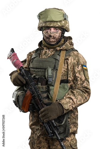 Ukraine officer in mechanized infantry uniform isolated with clipping path on white background. (Flag and arms of Ukraine on the shoulder. Patch on the chest with the inscription Ukraine in Ukrainian)