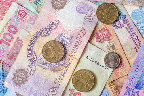 Ukrainian hryvnia, various coins and bills, old and new. Cash.