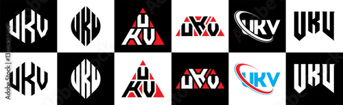 UKV letter logo design in six style. UKV polygon, circle, triangle, hexagon, flat and simple style with black and white color variation letter logo set in one artboard. UKV minimalist and classic logo