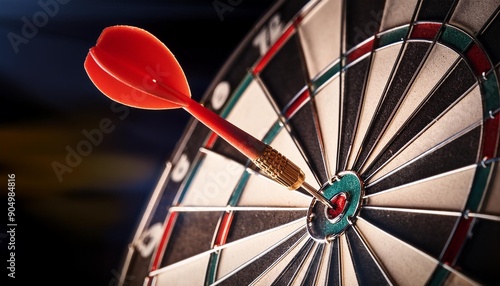 Ultimate Success: Single Red Dart Strikes Bullseye on Dartboard"