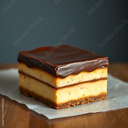 Ultra HD, hyper-realistic, 32K pixels, cinematic three-layer Nanaimo bar squares with glossy chocolate top on parchment paper side lit.